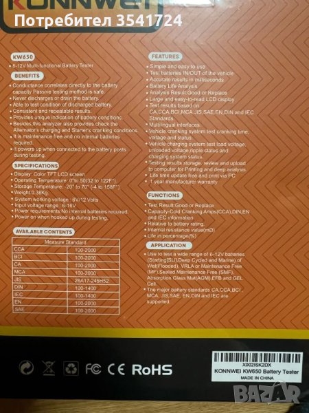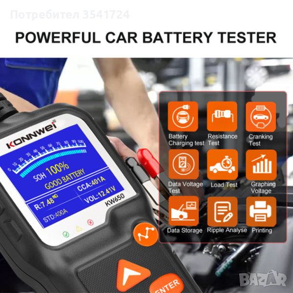 Пускам за продажба уред KONNWEI KW650 за тестване на акумулатори 6v и 12v, както и за тестване на стартера и алтернатора на автомобила ви. Това е професионалния модел на фирмата и може да показва графични резултати от теста на батерията, U-I форма на вълната. Може да бъдат запазени, прегледани и отпечатани на компютър или лаптоп резултатите от теста. Безплатни актуализации на софтуера.