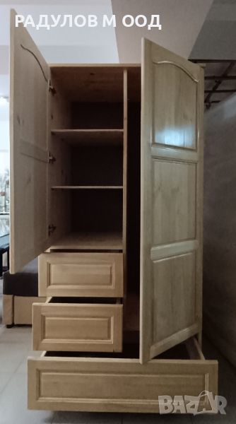 Двукрилния гардероб е изработен от висококачествена масивна чамова дървесина.