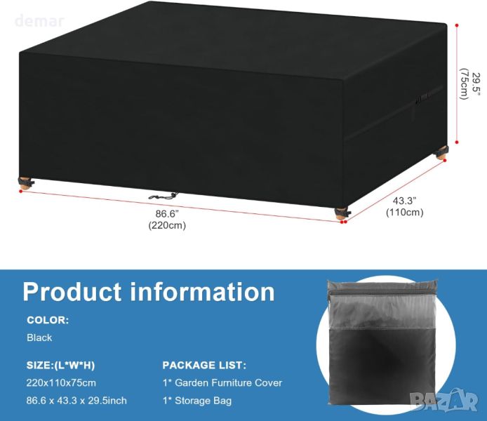 Тази издръжлива покривка за градинска мебел е изработена от оксфордски полиестер с дебело PU покритие, което предлага превъзходна водоустойчивост, устойчивост на атмосферни влияния, прах, UV и устойчивост на разкъсване в сравнение с PVC. Калъфът разполага с регулируеми каишки за закопчаване за по-добро прилягане, подсилени кантове, двоен шев и специална водоустойчива лента за предотвратяване на изтичане на шевовете. Включва 4 ремъка с щракване и 2 шнура за закрепване при силен вятър. Лесен за почистване и съхранение, предлага се с чанта за съхранение и е с размери 220x110x75 см, като побира различни мебели за вътрешни дворове като маси, столове, дивани и комплекти от ратан. Измерете мебелите си, преди да поръчате, за да паснат най-добре.