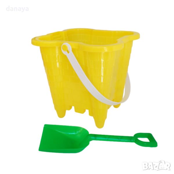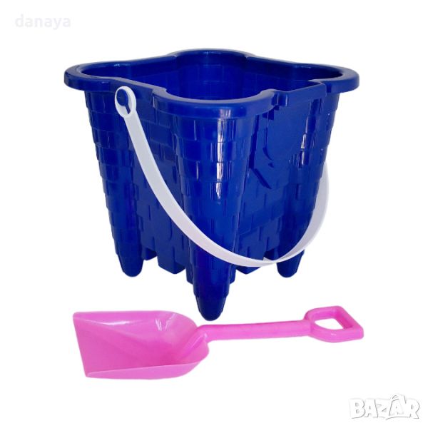 Комплект плажни играчки за пясък – кофичка за пясък с форма на красив замък + лопатка за пясък. Играчки за пясък, които ще развихрят въображението на детето. Чудесен плажен комплект за весели игри на плажа или на пясъчника.