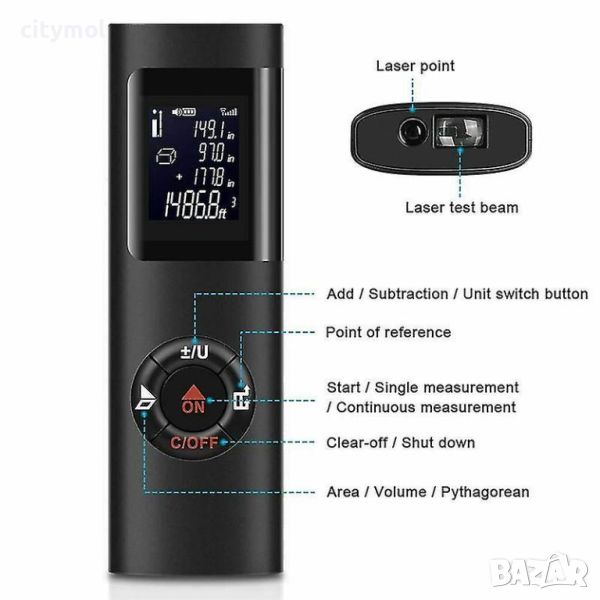 Поддържа измерване на разстояние, изчисляване на повърхност/обем, режим на Питагор и прости математически изчисления.