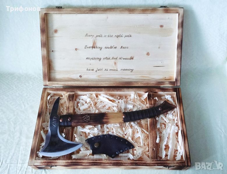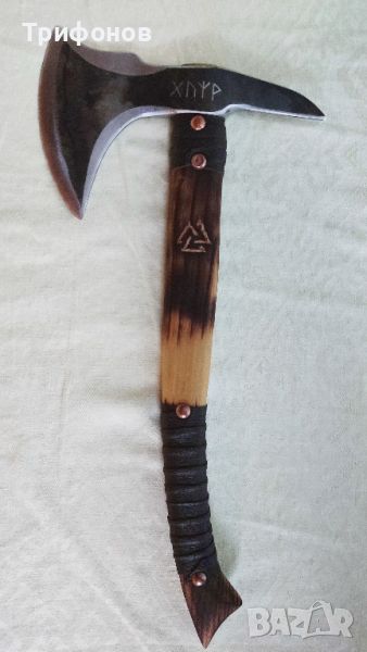 - Тази брадва е идеална за всички, които обичат да се наслаждавате на външния вид и усещането на ръчно резбована брадва, за всички, които обичат викингските форми /оси/. Брадвата може да бъде и уникален декоративен предмет във Вашия дом или удобен инструмент. Тази брадва може да се използва за всякакви задачи, включително хвърляне, сечене, кастрене и разделяне на разпалване, както и за теренна работа. Приятен подарък за годишнини, рожден ден и за много други случаи за подаръци! Може да е най-доброто функционално произведение на изкуството и декорация във Вашия дом, както и истинска мъжка брадва! Тя е уникален подарък за мъж! Добавете чар в дома си с този уникален артикул! Бъдете единствени и неповторими с подаръка, който може да направите!