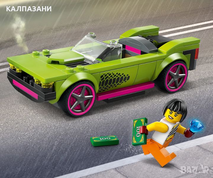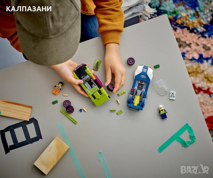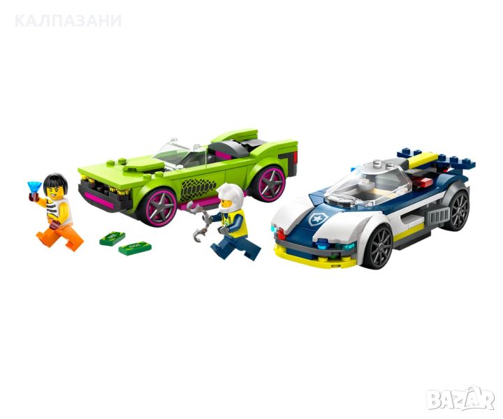 Забавен комплект играчки с кола LEGO® City за възраст над 6 години, включващ полицейски джип и мощна кола за епични преследвания с минифигурите на полицай и престъпник. Имаше бягство от затвора! Вмъкнете се в кабината на страхотния полицейски джип и се втурнете да преследвате един от най-търсените престъпници в LEGO® City. Машината е оборудвана с голям заден спойлер, страхотни джанти и гладки нископрофилни гуми за допълнителна скорост и сцепление. Влизайте в завоите със свистене на гуми и правете страхотни дрифтове, за да надбягате престъпничката в нейната високоскоростна мощна кола! Очаква ви страхотен екшън в LEGO City! Отдайте се на високоскоростно забавление и вълнение с комплекта за игра с полицейска кола за деца над 6 години. Комплектът LEGO® Преследване с полицейска кола (60415) за момчета и момичета включва страхотен полицейски джип и превозно средство за бягство, плюс минифигури на полицай и престъпник, за забавна ролева игра и разказване на истории. Строителният комплект за игра включва лесно за следване ръководство за построяване с картинки и цифрови инструкции „стъпка по стъпка“, налични в приложението LEGO Builder. Отведете своя малък строител на забавно приключение с интуитивния помощник за конструиране. В него децата могат да визуализират моделите в 3D, докато строят. Приложението също им позволява да проследяват процеса на конструиране и да изследват и записват виртуални комплекти за игра. Вашият град, без ограничения! Комплектите LEGO City са идеален подарък за всяко дете, което обича игра с въображение. Структурите с множество функции, реалистичните превозни средства и вдъхновяващите герои позволяват на децата да изследват света около тях чрез истории и сценарии, които изобразяват живота по забавен и вълнуващ начин.