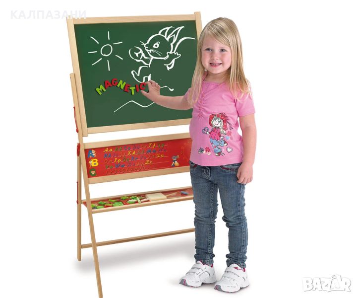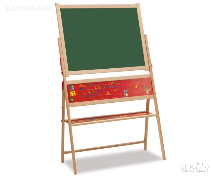 С аксесоари - в допълнение към дъската от бук от 40 х 67 х 110 см., комплектът включва още 48 магнитни букви, 10 тебешира и гъба.