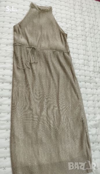 Дълга златиста рокля с блестящ ефект и разтеглива материя. Нова е, не е носена изобщо. Размер 2хл, дължината е 134см.