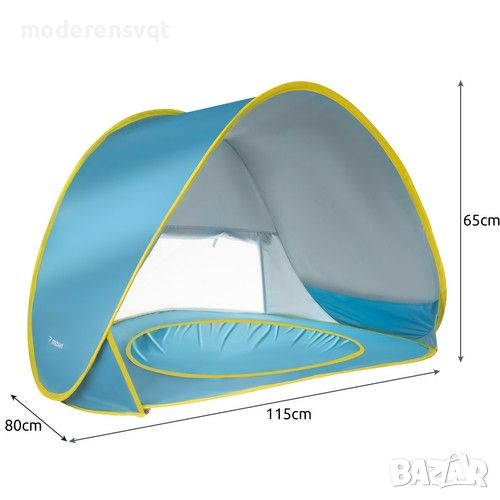 ВГРАДЕН БАСЕЙН - допълнително дъното на шатрата е оборудвано с водоустойчив басейн от плат, който може да се използва за игра с вода или като пясъчник. Всичко, което трябва да направите, е да изкопаете дупка на плажа за басейна и да поставите палатка в нея.