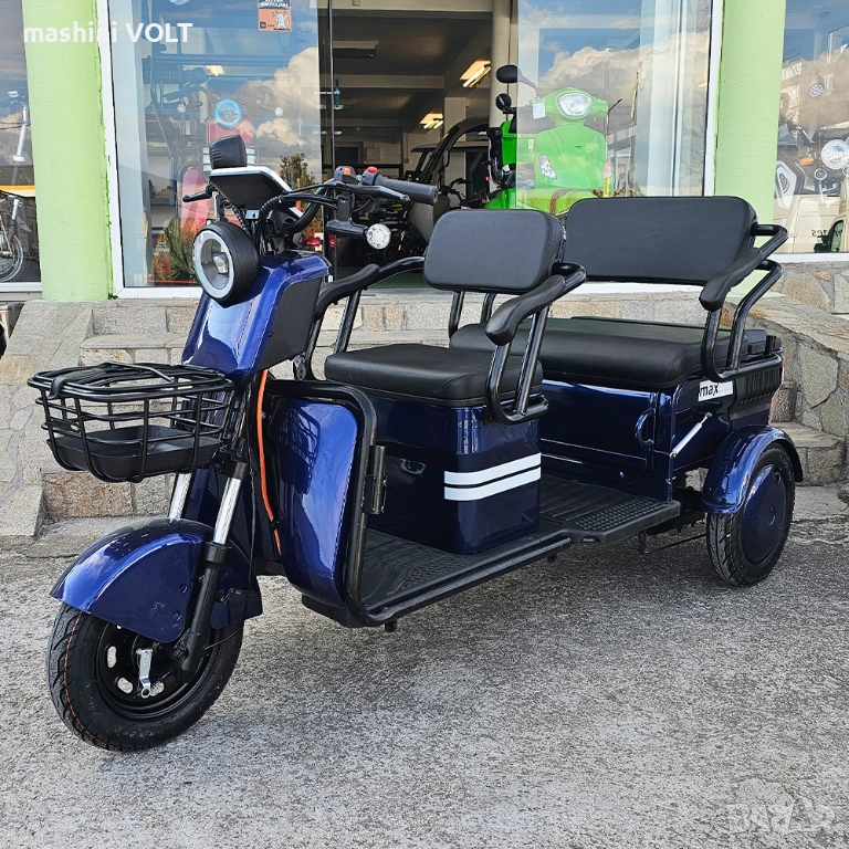 Електрическа триместна карго товарна триколка BULLMAX B10. Триколката е абсолютно без аналог на пазара, нищо общо с предлаганите подобни такива. Предназначена е за един водач и двама пасажера. Триколката разполага с предна кошница, заден багажник и след вдигане на задната седалка се оформя карго отделение за багаж. Изключително маневрена и мощна със задно предаване и диференциал. Триколката разполага със пълна светлинна окомплектовка – габарити, преден LED фар, задни LED стоп светлини, предни и задни мигачи.