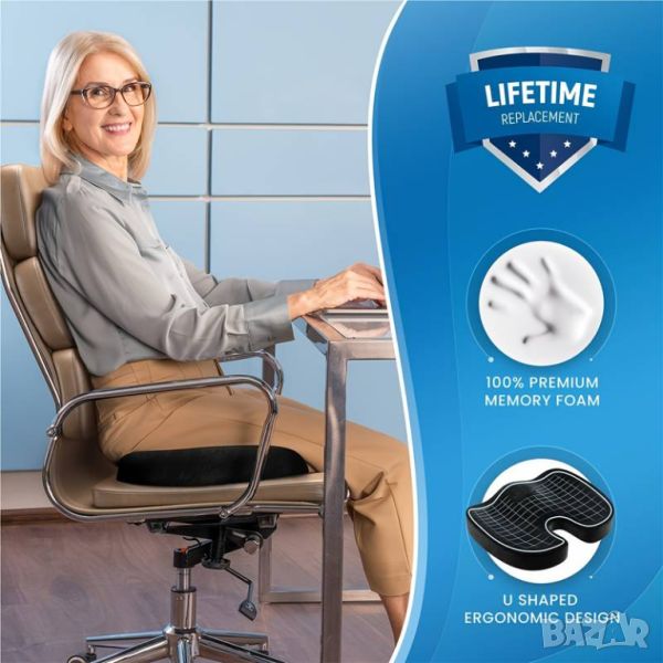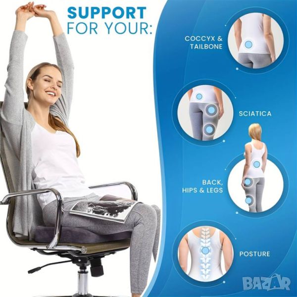 Голяма възглавница от мемори пяна, с дишаща материя, която не предизвиква изпотяване.Идеална за дома, офиса или пътуването, в люлеещ се стол, офис стол или на седалка в кола.Намалява натиска върху опашната кост, което може да помогне за предотвратяване и облекчаване на болки в долната част на гърба и/или ишиас