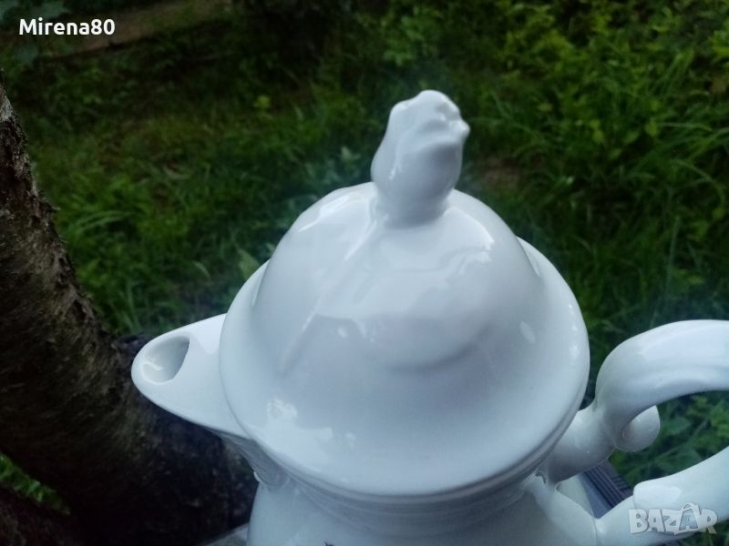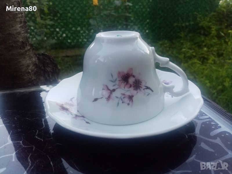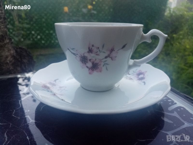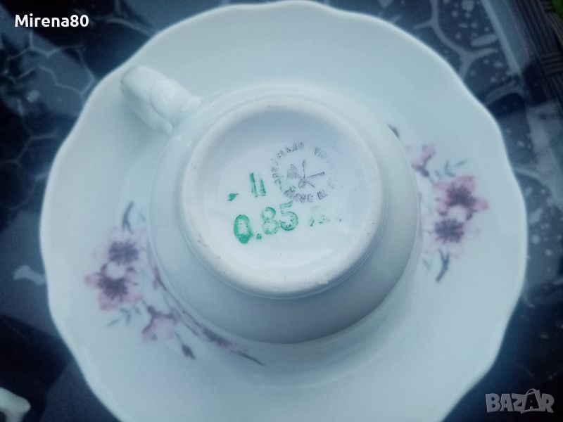 български, но изкопиран изцяло от братята немци като дизайн. От формата на чашата, чайника и т.н. до релефната роза на капачето на съдинките - просто разкош ! Любим, харесван декор - ябълков цвят. Без кант. Сервозът е нов , с кашончето от едно време, но за жалост 1 чаша е с пукнатина, и цената е съобразена.