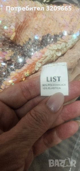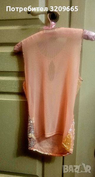 Оригинален дамски топ на марката LIST.Размер S.Предната част е изцяло в пайети,гърба е тюл.Много нежни прасковени цветове.Стилен и изработен като произведение на изкуството е.Слаган един път по повод.БЕЗ ЗАБЕЛЕЖКИ.КАТО НОВ. Цена 170лв
