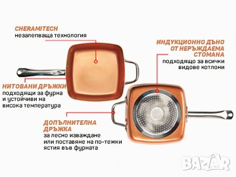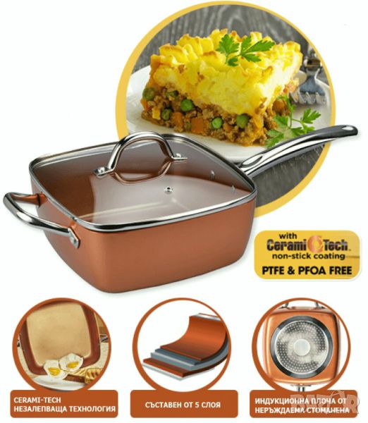 Чисто нов дълбок тиган Copper Square Pan комплект 4 части , 6 начина на готвене. Незалепващо Cerami Tech покритие. Индукционно дъно от неръждаема стомана. Капак от закалено стъкло и още.