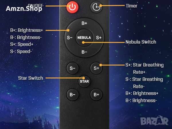 Можете да използвате дистанционното управление, за да регулирате шаблона, яркостта и скоростта на въртене, за да персонализирате прожекционния ефект, който харесвате. Моделите на звезди или мъглявини могат да се използват едновременно или поотделно. Освен това можете да настроите таймера на 45 или 90 минути, като в този случай светодиодният звезден проектор за нощна светлина ще се изключи автоматично, когато заспите под звездно небе.