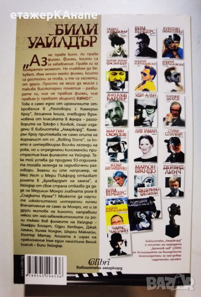 „Аз не правя кино. Аз правя филми. Филми, които са за забавление. Правя ги за конкретен момент. Не очаквам да векуват. Има много малко филми, които са достойни за това, заснети от други. Просто не мога да мисля с тези високопарни понятия – разбирате ли, ние не правим филми, ние правим (с превзет акцент) КИНО!”. Това е само едно от ироничните откровения в „Разговори с Били Уайлдър”, безценна книга, очевидно вдъхновена от класиката в жанра – разговорите на Трюфо с Хичкок, също издадени в библиотека „Амаркорд”. Камерън Кроу притежава не само опита на журналист от сп. “Rolling Stone”, за което е интервюирал всички легенди на рока, но и киноманските си пристрастия към филмите на Уайлдър. Така той успява да придума 93-годишната тогава легенда за задълбочени разговори. Знаели ли сте например, че Мей Уест и Мери Пикфорд отказват ролята в „Булевардът на залеза”, а Уайлдър от своя страна отказва да даде на Мерилин Монро главната роля в „Сладката Ирма”? Можете да научите изключително интересни лични впечатление не само за Монро, но и за други митове на киното, направили някои от най-забележителните си роли тъкмо във филмите на Уайлдър – Хъмфри Богарт, Одри Хепбърн, Джак Лемън, Уилям Холдън, Шърли Маклейн, Уолтър Матау. Книгата е забележителен израз на преклонение от един от най-интелигентните режисьори на модерното кино към наистина велик класик – Били Уайлдър.