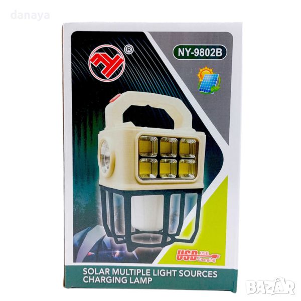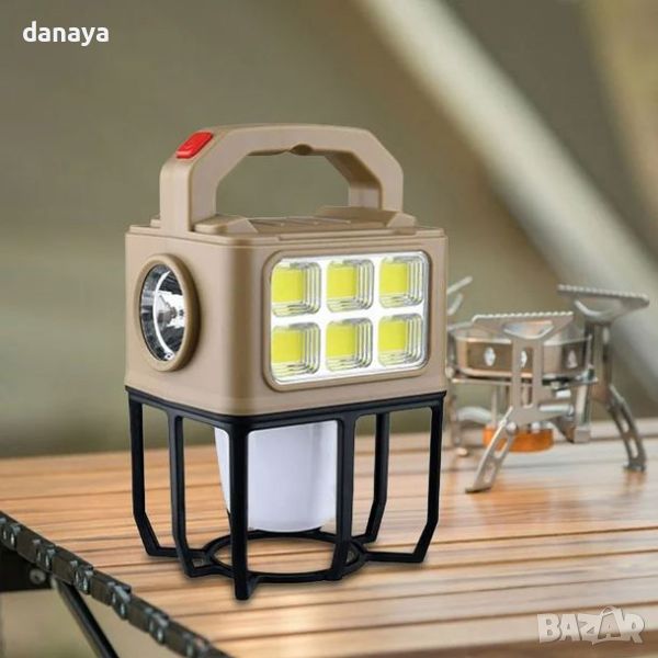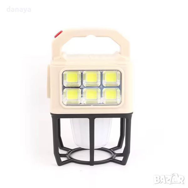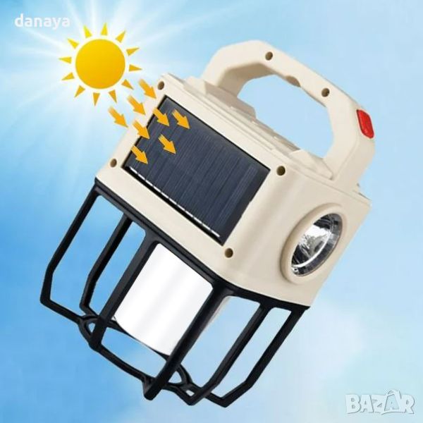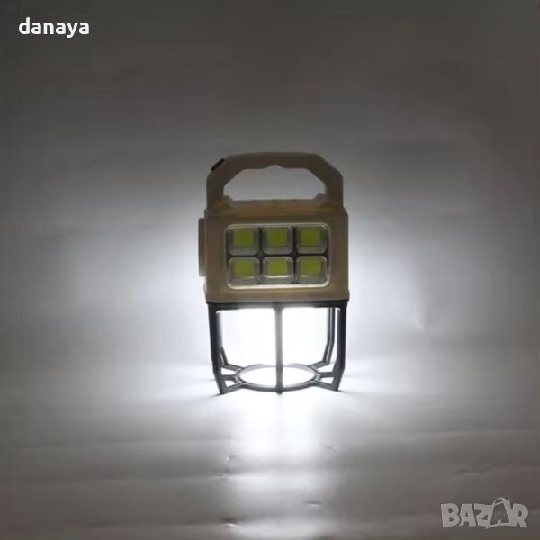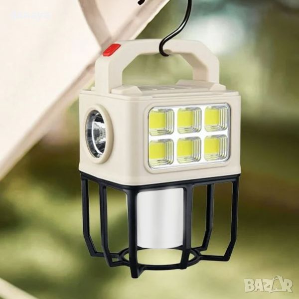 Мултифункционална соларна презареждаема лампа с 3 режима на светене. Управлява се само с един бутон. Къмпинг фенер, който може да се зарежда с USB или от слънцето. Работи със светлина COB tech, по-висок лумен и по-добра светлинна ефективност.