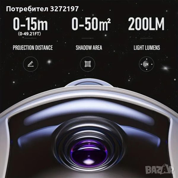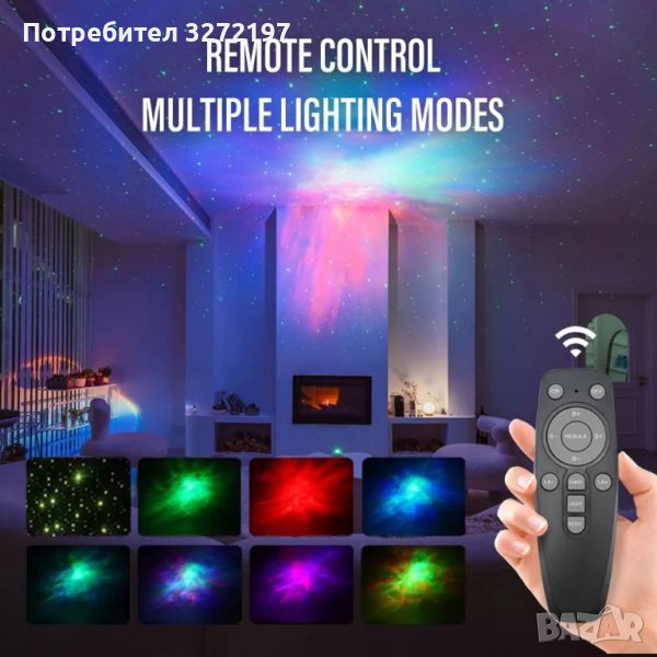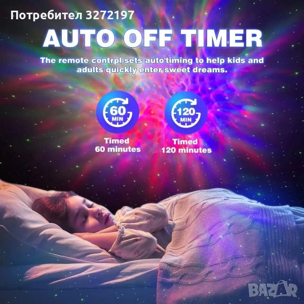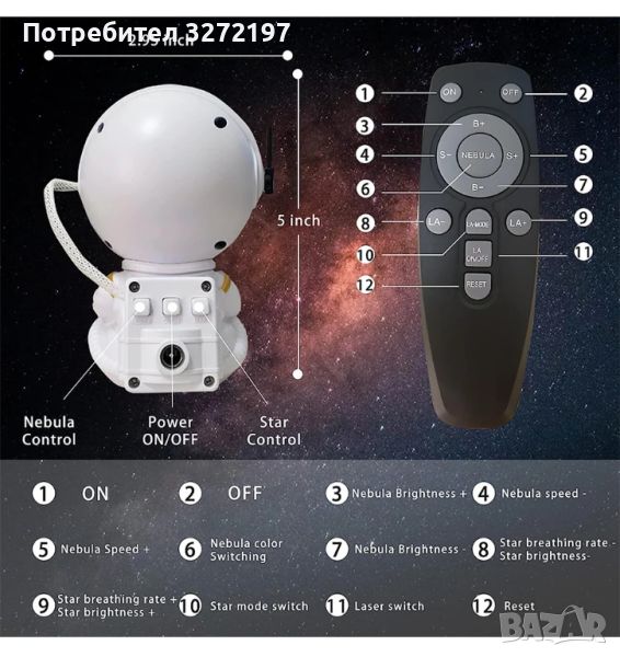 2: ДИСТАНЦИОННО УПРАВЛЕНИЕ И ТАЙМЕР - Този звезден проектор има два метода на управление: бутон за връщане назад и дистанционно управление. Могат да се правят корекции за превключване между режимите на мъглявина и звездна светлина, цвета и яркостта на мъглявината и честотата на мигане на звездата. Моделите звезда или мъглявина могат да се използват заедно или поотделно. В допълнение, таймерът може да бъде настроен на 60 или 120 минути и автоматично се изключва при достигане на зададеното време.
