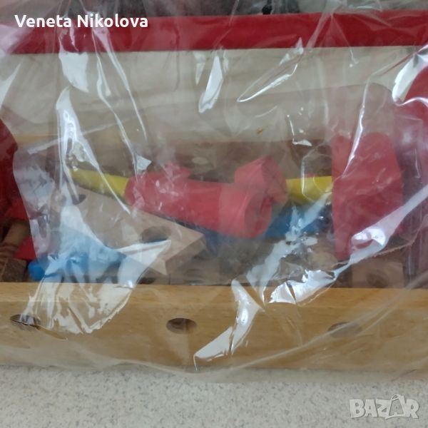 Образователна дървена играчка "Малкият занаятчия аз" с инструменти и ленти за завинтване и набиване, изработени от дърво. Съдържа: чукче, отвертка, гайки и др. За деца над 3 години. Производство на немската фирма "Simba ". Колекция от соца. Съвсем леко нарушена опаковка (почти не се забелязва).