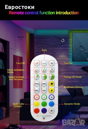 Светодиодните ленти с функция за дистанционно управление могат да регулират 16 милиона промени в цвета чрез опцията „Направи си сам“ в приложението, създавайки отлична светодиодна светлина за настроение. Можете също така да промените честотата на ритъма на лентата с LED светлини, за да създадете романтична и цветна фестивална атмосфера. LED светлинната лента е най-добрият избор за спалня, стена, таван и дъно на маса! (не е водоустойчив, само за вътрешна употреба)