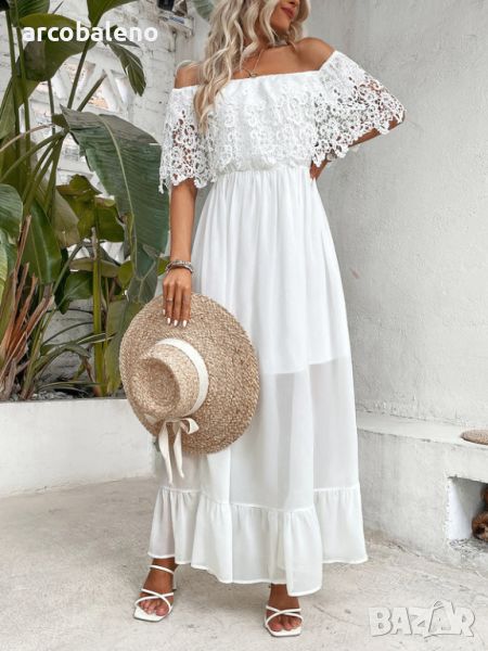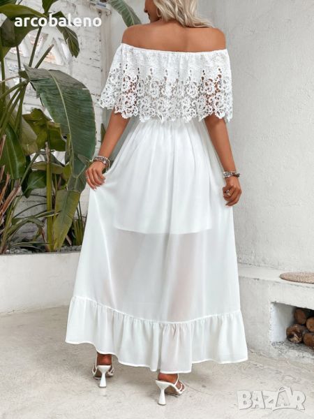 Изработена от 100% полиестер, тази рокля с отворени рамене включва сложни дантелени панели от гипюр и женствен подгъв с волани. Елегантният дизайн и гъвкавият стил го правят идеален за различни поводи, добавяйки нотка изтънченост и чар към вашия гардероб.