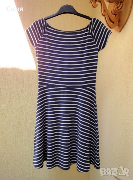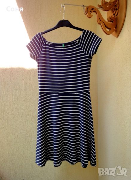 Рокля BENETTON в синьо и бяло райе подходяща за момичета и дами в XS/ S размер. Дължина на роклята от рамото 77 см. Подмишници около 37 см. Мека и удобна материя (трико), което се разтяга. Без забележки. Отлично състояние.