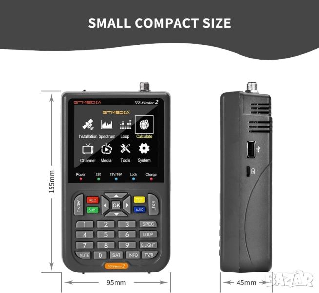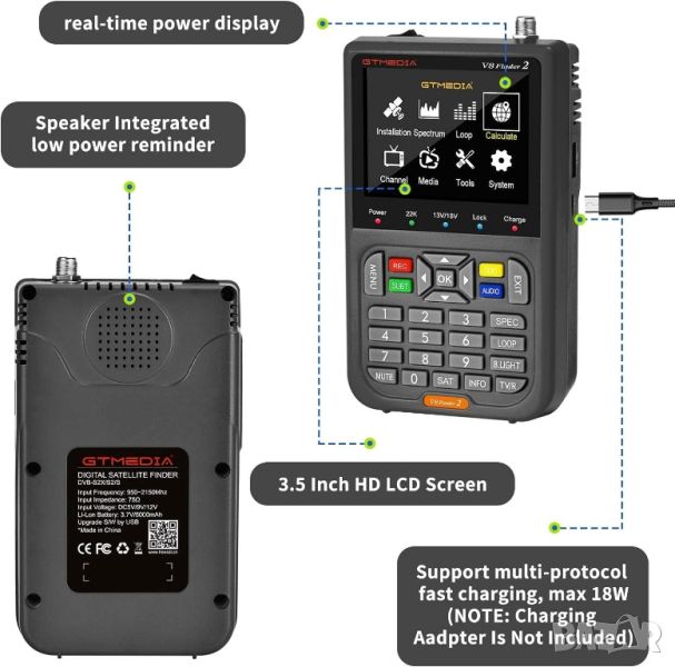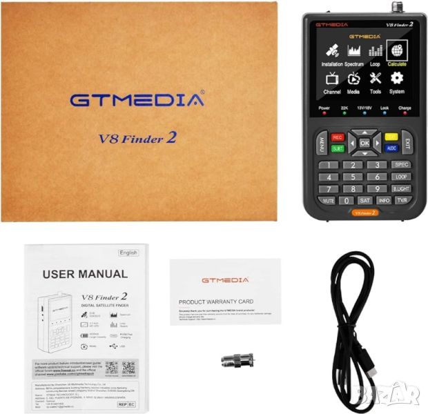 GTMEDIA V8 Finder2 е DVB-S/S2/S2X и MPEG-2/4 H.264(8 Bit) съвместим ръчен сателитен измервателен уред. Този уред за търсене на сателит е цифрово измервателно устройство за силата и качеството на сигнала, предоставя всички функции, необходими за инсталиране и проверка на цифрова сателитна телевизионна услуга за жилищни домове или многожилищни единици и поддържа предварително задаване на цялата сателитна информация.