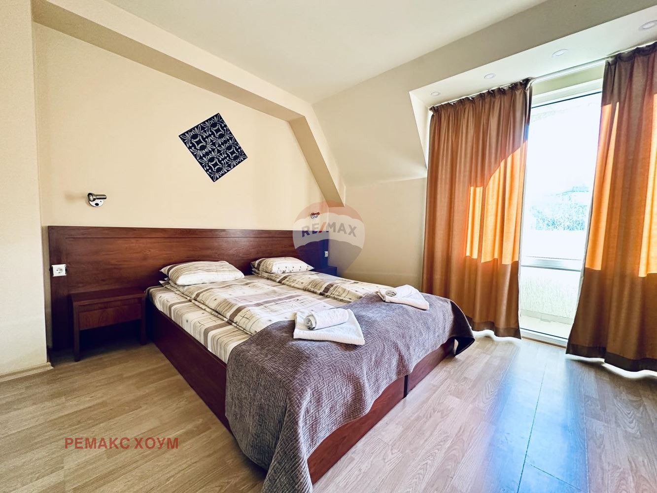 Имотът се представлява уютен хотел с капацитет до 80 човека и 15 деца. Сградата е тухлена, има външна изолация и асансьор. Изложението на имота е югоизточно, което го прави топъл и слънчев. Отоплява се с климатици. Контролиран достъп с карта към всяка стая и други помещения.