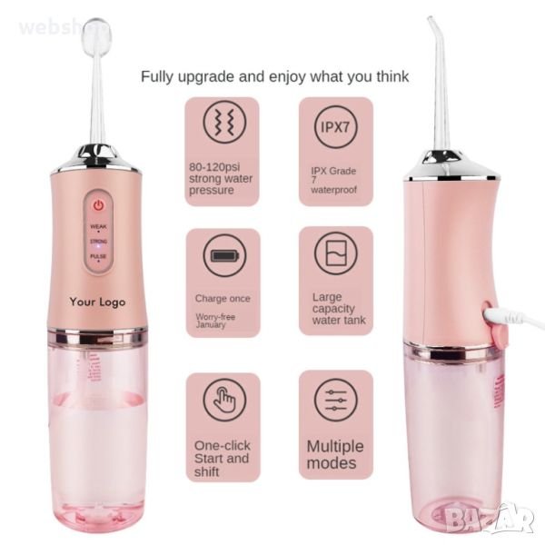 Този зъбен душ е компактен и има страхотен и стилен дизайн. Снабден е с бутон за включване/ изключване и има 3 режима на действие с различен интензитет – слаб, силен и пулсиращ. Пулсиращият режим е специално предназначен за масаж на венците. В комплекта ще намерите и допълнителни 4 приставки, с които ефективно да почиствате езика и зъбите си, както и джобовете на венците. Зъбният душ е устойчив на вода, а освен всичко друго е и супер безшумен. Може да го ползвате дори когато всички спят Ултра тънката – само 0,6 мм. водна струя позволява изчистването на между-зъбното пространство, дори и на труднодостъпните места. Благодарение на мощната си батерия, зъбният душ ще ви осигури дълго време в режим на работа. Зареждането на оралния душ става с USB кабел, а той се предлага в предлага в 2 цвята - розов и цвят мента с мляко. ТЕХНИЧЕСКИ ХАРАКТЕРИСТИКИ: