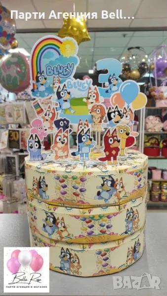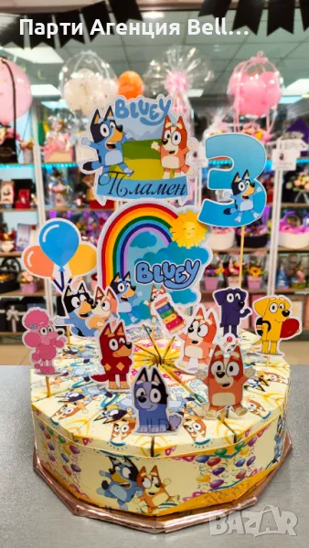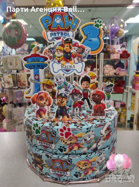 Можете да поръчате украса за тортата, която включва: Банер с името на детето и годинките, топери с анимационните герои и подложка към тортата на цена от 8 евро.