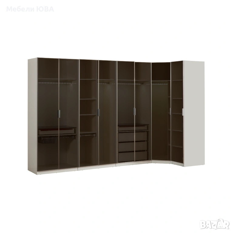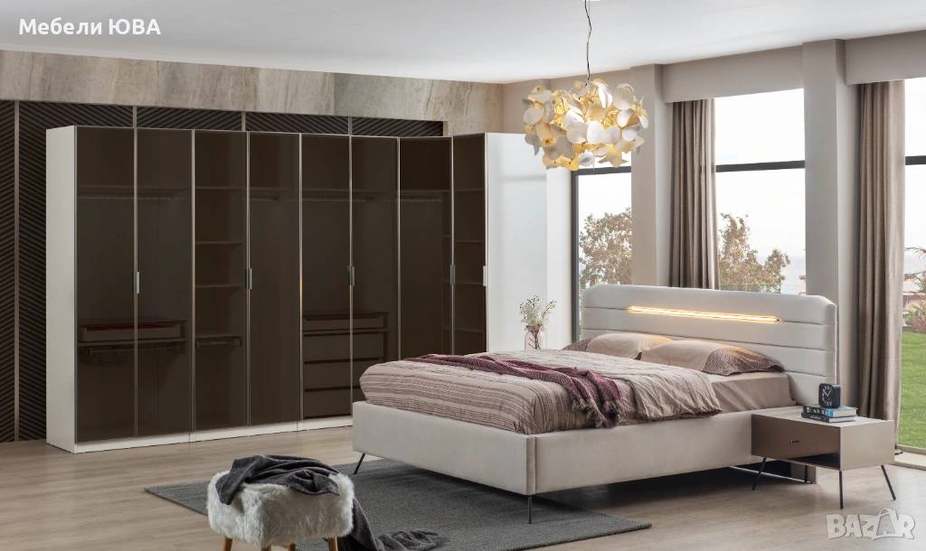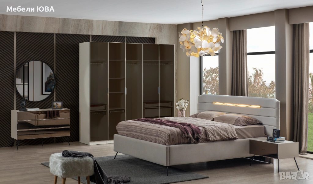 Спален комплект LEDLI включва: тапицирано легло с подматрачна рамка и механизъмза повдигане,гардероб (модулен), нощни шкафчета 2 бр. ,тоалетка с огледало