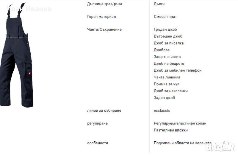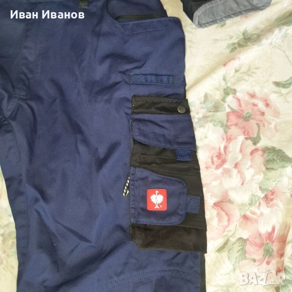 esclassic - изпитани, класически модели в изчистени цветове -тъмно синьо с черно на места .Изработена от плътна смесена материя с 310 g/m²ергономична кройка със спортен, модерен силуетСтранично разтеглив колан Flexbelt ® , меко грапав отвътреизключително стабилен, троен шев на вътрешния крачолшироки гайки за колан с велкро за работна чанта2 джоба и 2 задни джоба, подсилени с CORDURA®Подсилен, функционален джоб за линийка и джоб на бедрата от няколко частиВентилация с цип от двете страни на бедрата отзадГорен джоб за наколенки с велкро закопчаванеНаколенка от здрав CORDURA ®фини рефлекториразтеглив коланподсилени джобове за наколенки2 прорязани джоба2 големи задни джоба, единият с капак и велкро закопчалкаДжоб на бедрата, отделения за инструменти и прикрепено отделение за мобилен телефон с капак и велкро закопчалкадвоен джоб за линийка отдясно с отделения за химикалкиПримка за чук и джоб за линийка отлявоГайки за колан и YKK ципГръден джоб с капак (закопчалки и велкро закопчалки) и 2 ватирани отделения за химикалкиеластични презрамки със здрави катарамиВътрешен джоб за лигавник с ципМатериал:Външен плат65 % полиестер /35 % памук(прибл. 310 g/m²)ДЖОБОВЕ ЗА НАКОЛЕНА – ЗАЩОТО ЗДРАВЕТО Е НА ПЪРВО МЯСТОНе може да има компромиси, когато става дума за здраве. Особено не, когато става въпрос за защита на коленете, които носят по-голямата част от натоварването при работа. Добрите наколенки не само облекчават напрегнатите стави, но и предотвратяват хронични заболявания. Поставени в джоб на наколенка, подплатените помощници гарантират надеждно облекчение.