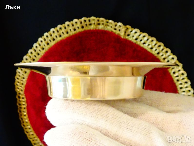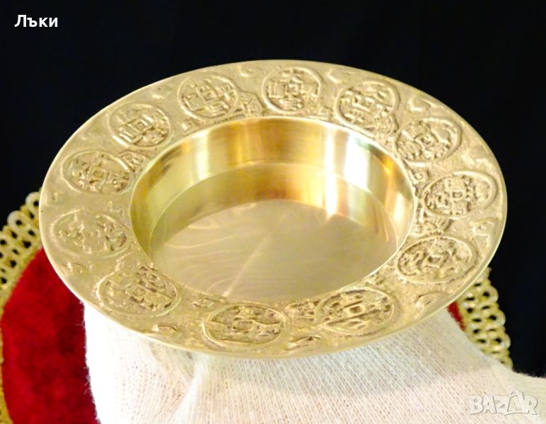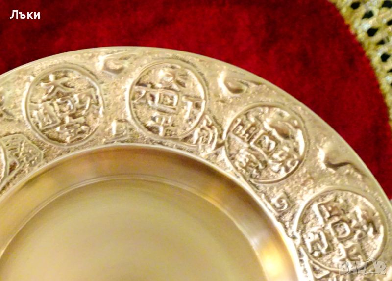 Старинна китайска чиния,купичка за ядки,ръчно отлята от масивен бронз със златен блясък.Релефно декорирана по периферияте с изписани различни благословии по фън-шуй.Диаметър 10 см.,височина 2 см.,тегло 100 гр.