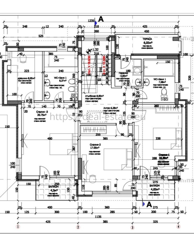 * втори етаж с площ 143 кв.м. - коридор, три самостоятелни спални, дрешник, две бани с тоалетна, перално помещение и три тераси.