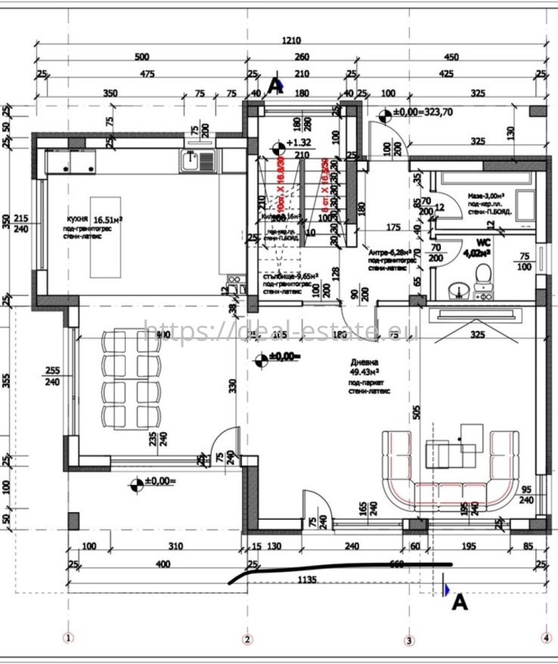 * първи етаж с площ101 кв.м. - е разположена просторна дневна с кухня в едно общо помещение с достъп към вътрешния двор, баня с тоалетна и килер. С вътрешно стълбище се стига до втория етаж.