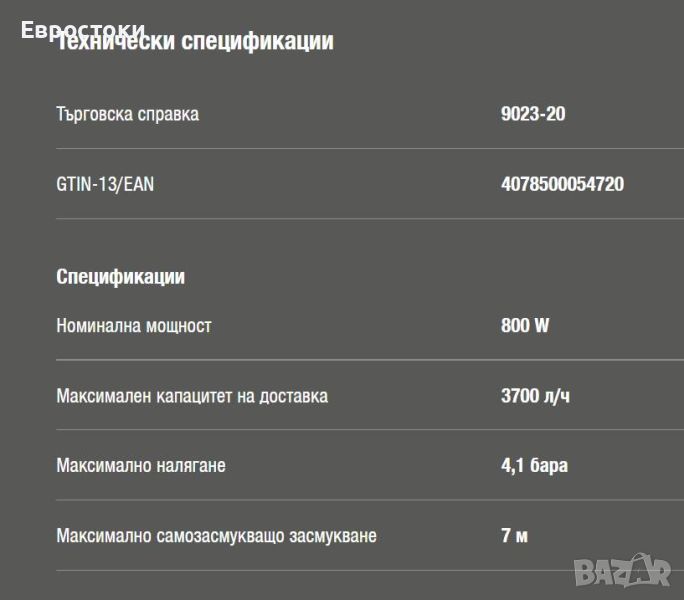 кладенци, цистерни или варели за дъжд, се пренася от мощната електрическа помпа до мястото, където е необходимо в къщата и градината. Резервоарът под налягане 3700/4 осигурява впечатляваща мощност от 4,1 бара при 800 W и може да изпомпва до 3700 литра вода на час от дълбочина до 7 метра. Има 19-литров резервоар за вода с EPDM мембрана с ниска поддръжка и може лесно да се пълни или изпразва ръчно. Запушалката за източване позволява бързото източване на водата от резервоара, например когато се прогнозира замръзване. Компактният резервоар под налягане от GARDENA не само спестява място, но също така впечатлява със здрав пластмасов корпус, подсилен със стъклени влакна, и керамична система с двойно уплътнение с вал на помпата, изработен от неръждаема стомана. Интегриран прекъсвач за термично спиране го предпазва от всякакъв риск от повреда от прегряване. Има възвратен клапан и висококачествени месингови вложки с резба. Тези аспекти не само увеличават издръжливостта, но също така ви улесняват да използвате уреда като надежден, постоянен елемент с ниска поддръжка във водопроводната инсталация на вашия дом. Практичният манометър винаги показва текущото налягане в резервоара за съхранение. Допълнителният изход за двойна връзка G1" прави използването на модула за резервоар под налягане 3700/4 още по-гъвкаво, тъй като можете да прикрепите висококачествени оригинални продукти и аксесоари на GARDENA System. Получавате 5 години гаранция от GARDENA за този устойчив, мощен, и битов резервоар под налягане, проектиран от Германия, с проста онлайн регистрация Почувствайте силата на помпите GARDENA с повече от 40 години опит в дренажа, напояването и домашната употреба.