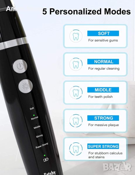 Два вида глави – заостреният връх е подходящ за почистване на малки петна по венците, плоският връх се използва за почистване на голям зъбен камък по повърхността на зъбите.