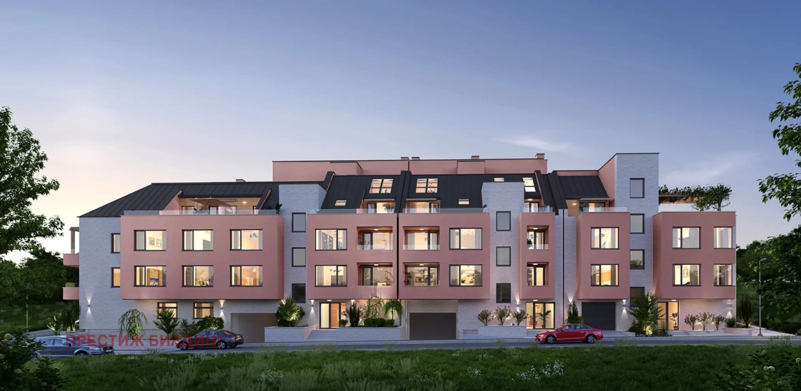 Съчетанието на тези материали с тъмносива дограма и стъклени парапети оформя завършена модерна визия на комплекса.