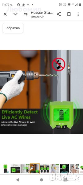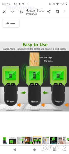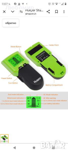 Търсачът на шипове Huepar използва интелигентен микросензорен чип с най-висока чувствителност за точно и бързо намиране на ръбове и център на метал, шпилки, греди, тръби, AC проводник под напрежение зад стени, подове и тавани. Този скенер за шипове може да усети промените в плътността зад стената и да локализира центъра на шипа с голяма точност.Цифровият стенен скенер предлага 5 режима на сканиране - Три режима на сканиране на шпилки на различни дълбочини, режим на сканиране на метал и режим на променливотоков проводник. Режимите на сканиране на шипове включват 1⁄2" (12 mm) дълбочина, 1" (25 mm) дълбочина и 11⁄2" (38 mm). Режимът за откриване на метал може да открие метал до 2,36" (60 mm) дълбочина, AC сканиращият режим може открива проводници под напрежение с дълбочина до 2" (51 мм). В режим на шпилка можете да откриете метал и дърво, така че да разберете дали материалът на шпилката е дърво или метал.Търсачката на греди се предлага с голям LCD дисплей, който разполага с функция за задно осветяване, която може да осигури ясен външен вид дори при условия на слаба светлина, като показва режим на откриване, централно насочване, индикация за изтощена батерия и т.н. Освен това предлага ясно звуково предупреждение за точно и ефективно откриване на точното местоположение на обектите. Бързото откриване със сигурност ви спестява повече време и усилия.Този сензор за променлив ток на този дървен метален сензор открива до дълбочина до 51 см/1,6 инча, когато работите в който и да е режим на сканиране, Предупреждението за кабел винаги е включено, за да ви предупреждава за наличието на променливотокови проводници под напрежение, което помага избягвате опасности, когато монтирате вашия телевизор, шкаф за баня, рамка за снимки, стелажи за гараж. Няма нужда да се притеснявате от пробиване на проводници под напрежениеСкенерът за стени със сензор за шпилки може бързо да намери ръбовете и центъра на метални шпилки, тръби, арматурни пръти, греди зад стени, подове и тавани, както и проводниците под напрежение. Полезно при инсталиране на пердета, рафтове, рамки за картини, парапети, удароустойчиви метални фитинги и др. Независимо дали сте професионалист, собственик на жилище или ентусиаст „направи си сам“, можете да намерите добро приложение в този електронен винтов скенер.