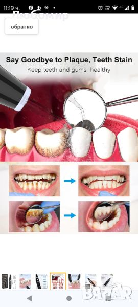 Комплект за почистване на зъби, Препарат за премахване на зъбен камък, Ултразвуков комплект за почистване на зъби за домашни грижи, Има 5 регулируеми режима и 3 сменяеми почистващи глави, черен.Професионална грижа за зъбите – препаратът за отстраняване на зъбен камък може ефективно да премахне зъбен камък и петна по зъбите, лесно да отстрани твърдия зъбен камък от зъбите, за да предотврати заболяване на венците. Когато използвате препарата за отстраняване в текущата си рутинна грижа за зъбите, делът на бактериите в устата намалява, което води до по-свеж дъх.Защита за вашите венци – комплектът за почистване на зъби работи само върху зъби или твърди предмети, абсолютно безопасен за защита на вашите венци.Два вида глави – заостреният връх е подходящ за почистване на малки петна по венците, плоският връх се използва за почистване на голям зъбен камък по повърхността на зъбите.Пазете зъбите си – зъбният камък може да доведе до пародонтоза. С премахването на зъбен камък можете да предотвратите това. Почистването на зъбите е от съществено значение.