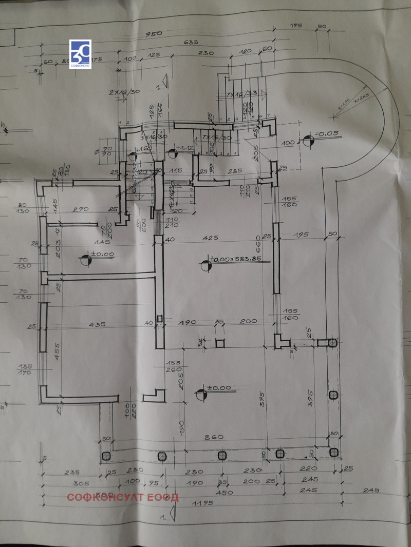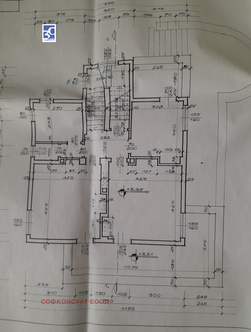 Конструкцията на къщата е монолитна, с каменни основи, стоманобетонни плочи и греди, и дебели носещи стени и е в отлично състояние. Подменена ел.инсталациия и дограма. Сградата е на четири нива със застроена площ 171 кв.м и обща площ 553 кв.м. Състои се от светъл полусутерен с излаз към градината, включващ гараж и обслужващи помещения. На първия етаж са разположени антре, кухня, трапезария и хол с излаз към просторна веранда, голяма баня с тоалетна. Вторият етаж се състои от три просторни спални с балкон към всяка от тях, и голяма баня с тоалетна. Тaванският етаж представлява отворено пространство, с възможност за различни функционални решения.