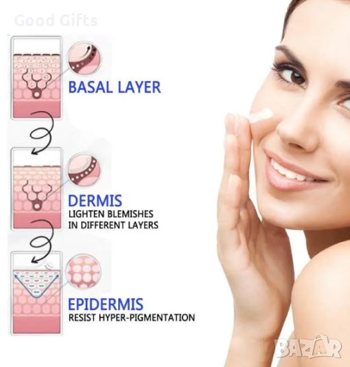 Той е нова усъвършенствана формула, която може да проникне дълбоко в кожата, за да намали тъмните петна, хиперпигментацията, белезите, обезцветяването, мелазмата, неравномерните тонове по лицето и тялото.