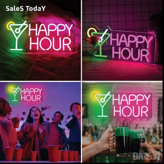 Светеща табела, лампа, Декоративна светлина за стена, Панел LED, неон, коктейл "Happy Hour" 43x21 см
