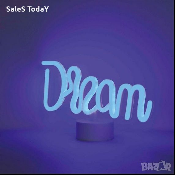 Настолна табела със синя led неонова лампа "Dream" върху основа Ø8.5см. С висок интензитет на светлината и дълъг живот. Работи с 3 AA батерии (не са включени) или с 1m USB кабел. Съдържа инструкции.