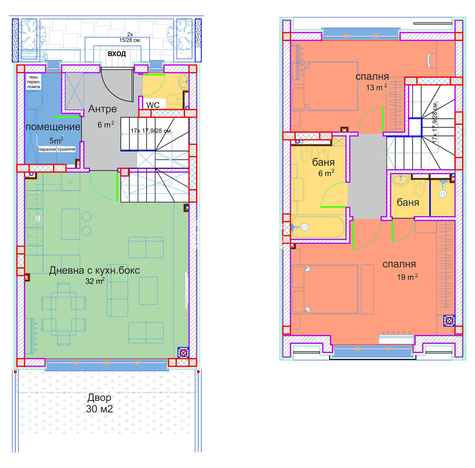 Оферта 64656: СТРАХОТНА ЛОКАЦИЯ !!! ЛЕСЕН ДОСТЪП !!! ЦЕНА НА АПАРТАМЕНТ !!! Предлагаме на вашето внимание двуетажна КЪЩА с ДВОР И ДВЕ ПАРКОМЕСТА, намира се на много комуникативна локация с асвалтов достъп ,чист въздух и на минути от големия град. Къщата е с РЗП 121,80кв.м и разпределение: етаж 1- дневна с кухненски бокс, тоалетна, килер и входно антре, етаж 2- две просторни спални, две бани с тоалетни, коридор и тераса към едната спалня. Имотът разполага с ДВА броя паркоместа и самостоятелно дворно място от 30кв.м. Къщата има Акт 14, продава се в степен на завършеност до тапа и замазка. При желание на купувача къщите могат да бъдат завършени до ключ.