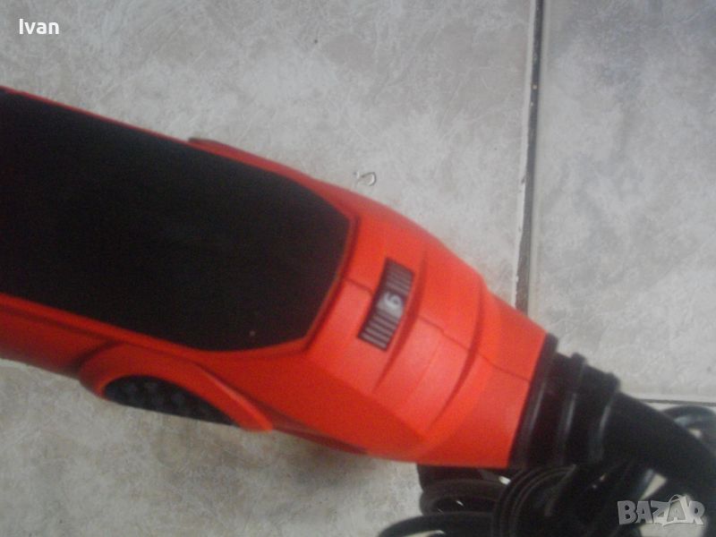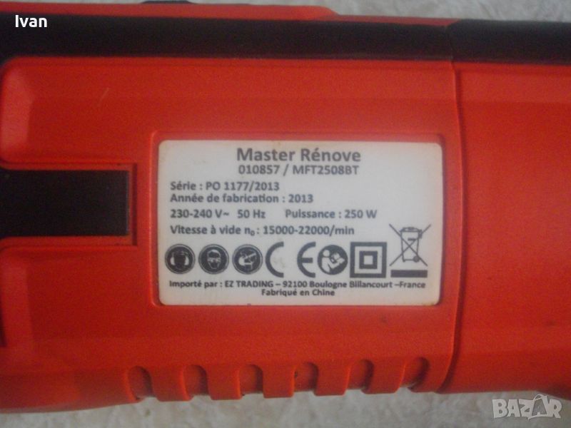 Описание на червен реноватор - мултиинструмент - комплект - 250 вата. Цена 159 лв. Съвсем нов силен и мощен реноватор-мултиинструмент за всякакъв вид работа-рязане,подостряне,шлайфане,шлифоване,шмиргелене,и всякакви други дейности,в зависимост от поставената приставка.Машината е френска марка и лиценз,упомената на фабричният стикер,производство Китай. Марка и модел-Master Renove MFT2508BT.В отлично техническо състояние.Работи много добре,с добри трептения и вибрации на главата.Мощност на мотора-250 вата,обороти-от 15000 до 22000 в минута,регулируеми с 6 степени.Пусков горен ключ с приплъзване.Стоманена редукторна кутия с хром покритие.Глава стандартна за шестограм ключ.Главата е универсална,с 4 закрепващи приставката метални кръгли зъбчета.Към машината има оригинален ключ за главата-шестенен и 1 брой нова оригинална приставка-нож за рязане на дърво и пластика.Комплекта е прибран в оригиналният си твърдосплавен пластмасов куфар с дръжка.Към машината и ма и оригинален накрайник-конектор на отпадъчен прах, със захват към корпуса на главата,показан на снимките.Тел. за контакти: 0 896782271.