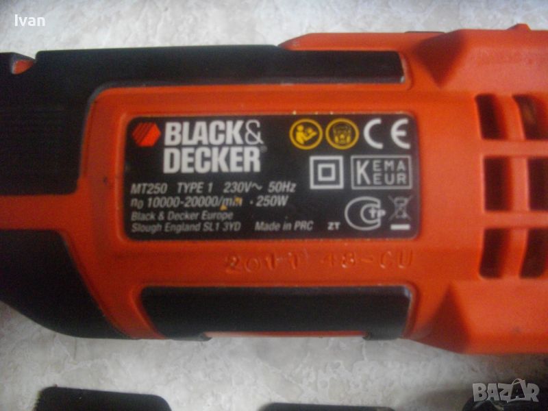 , професионален модел на Блек декер. Марка и лиценз-английски,производство-базирано в Китай. Марка и модел-Black Decker MT250. Машината е с много запазен външен вид, малко е работено с нея, в отлично техническо състояние. Работи много добре. Силна е, мощна, високообортна и ефективна при работа. Мощност на мотора-250 вата,обороти-1*******000 в минута,регулируеми с 6 степени.Горно противоударно нехлъзгащо се покритие на корпуса.Пусков ключ с приплъзване.Глава-с функция Супер заключване.Към машината има 1 брой оригинален диск-сфера кръгла,с хром-ванадиум покритие,за рязане и оформяне на метал и дърво,ситно и финно.Наличен е оригиналният ключ шестограм за главата.Комплекта е прибран в оригиналният си твърдосплавен куфар,с фабричното лого на марката.