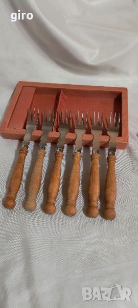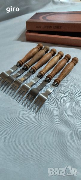 Ретро комплект от 6 броя средни вилици с дървени дръжки,произведени в завод "Петко Денев" Габрово през 1990 година. Вилиците са нови,не са използвани,в оригиналната си кутия.