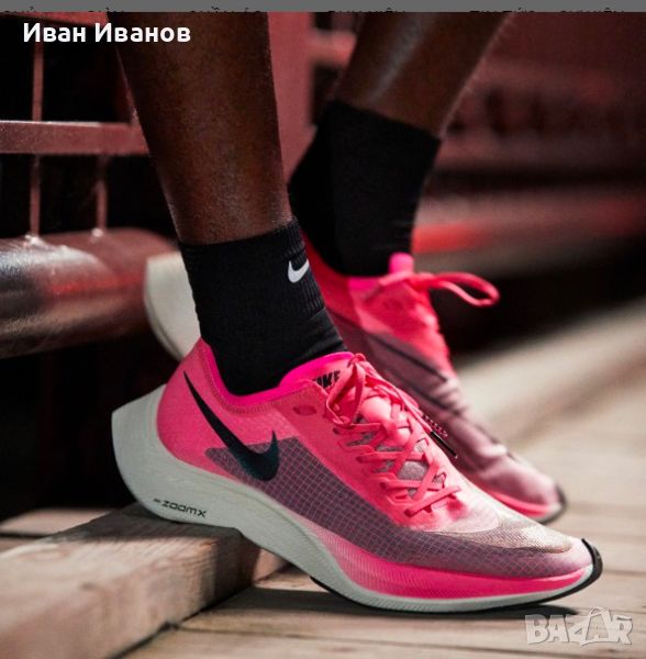 Nike ZoomX Vaporfly NEXT ‘Pink Blast’ AO4568-600Използвани броени пъти , С минимални следи , Перфектни Изключително леки , и удобни за лятото . Цена по магазините над 350 лева Тези обувки са познати като едни от най-добрите обувки за бягане и са супер леки, което ги кара да не се усещат, докато бягате с тях. Имат карбонова пластина в тях, което освен стабилност, допринася и за експлозивност и така наречената energy return. Zoomx foam е също нещо, което прави обувката уникална и да се усеща комфорта с всяка стъпка.