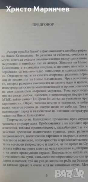 Генерале мой, битката завършва, правя рапорта си; ето къде воювах, ето как воювах, бях ранен, изплаших се, но не дезертирах; зъбите ми тракаха от страх, но пристягах здраво челото си с червена кърпа, за да не личи кръвта, и се хвърлях в атака. Едно по едно ще оскубя пред теб перата на моята гарга, душата си, докато от нея остане само малка бучка пръст, замесена със сълзи, кръв и пот. Ще ти разкажа борбата си, за да ми олекне; ще смъкна от себе си добродетелта, срама, истината, за да ми олекне. Ти как създаде „Толедо през време на буря“? Също такава, с тежки облаци, прорязана от жълти мълнии, отчаяно и непреклонно бореща се със светлината и тъмата, е и душата ми. Ще я видиш, ще я претеглиш изпод витите си вежди и ще я оцениш. Помниш ли онази тежка дума, която казваме ние критяните? „Където не сполучиш – върни се; където сполучиш – върви си!“ Ако не съм сполучил, дори само час живот да ми остава, ще се върна, за нова атака; ако съм сполучил, ще отворя земята, за да дойда да легна до теб.