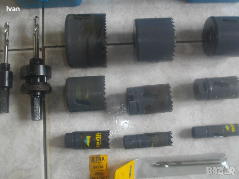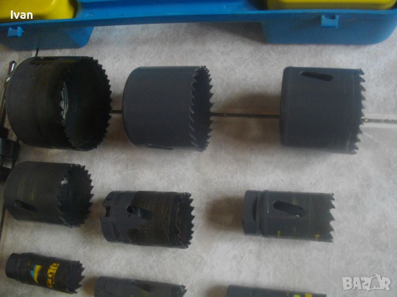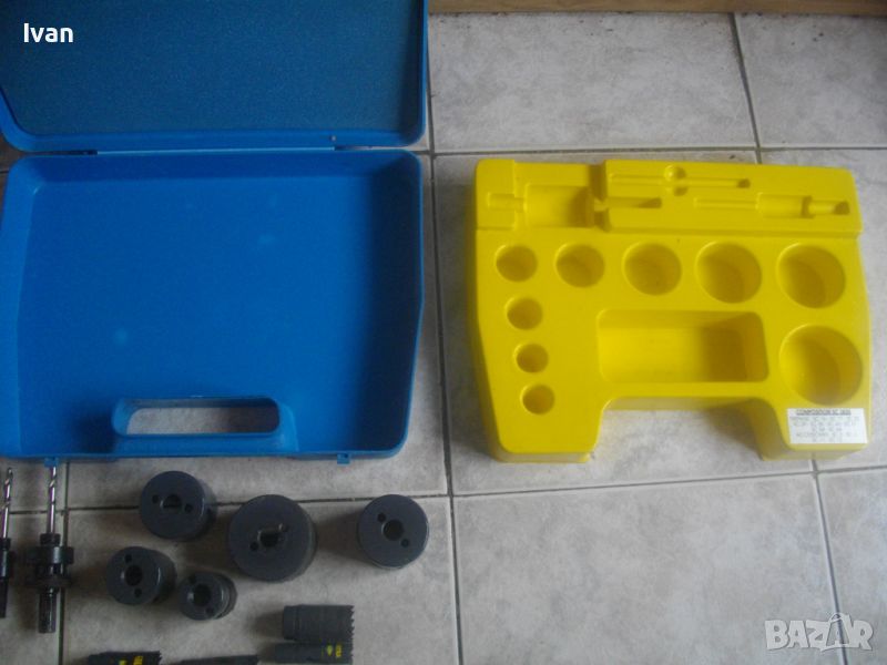Почти нов френски оригинален професионален комплект боркорони различни размери за отвори в дърво и др. небетонни материали и конструкции.