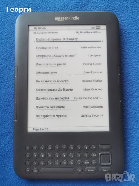 Продавам Kindle 3. Няма подсветка, с клавиатура . Може да чете с глас книги на Английски език. Работи добре всичко както трябва без проблеми. Продава се без кабел и зарядно, зарежда се с micro USB, от телефоните става.