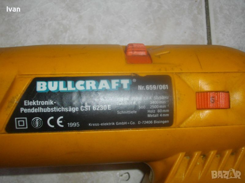 Професионален немски модел зеге - вертикален прободен трион /махален/на немската марка Булкрафт. Марка и модел на машината-BULCRAFT CST 6230 E . Производство - оригинално Германия 1995 г - Germany - упоменато на маркировките - старо, висококачествено производство. Много запазен външен вид - с машината е работено много малко. Отлично техн.състояние. Мощност на мотора - 350 вата ,обороти - на празен ход - 3 500 об./мин. Обороти скорост регулация 6 степени / 500- 2 500 об./мин. Дълбочина при рязане - до 60 мм. в дърво ,при рязане на метал - до 4 мм дебелина на метала. Наклно на плота - ъгъл рязане - бързо Куйк наместване, посредством голям върток на плота. Работна повърхност - плот - метална, инокс покритие. Прозрачен предпазител над главата. Глава . захват на режещият нож- Куйк система - бърза сменяемост на ножа - с две движения. Машината е за режещи ножове топ захват U образни - стандартни, универсални. Заден удобен пусков ключ, с превключване на поцзициите. Удобна кръгла задна дръжка. Наличие на вграден конектор 8място/ за скачване в накрайник за отпадъбна прах. Цвят на зегето - охра/ тъмно жълто/. Професионална държина на захранващ кабел - 350 см.